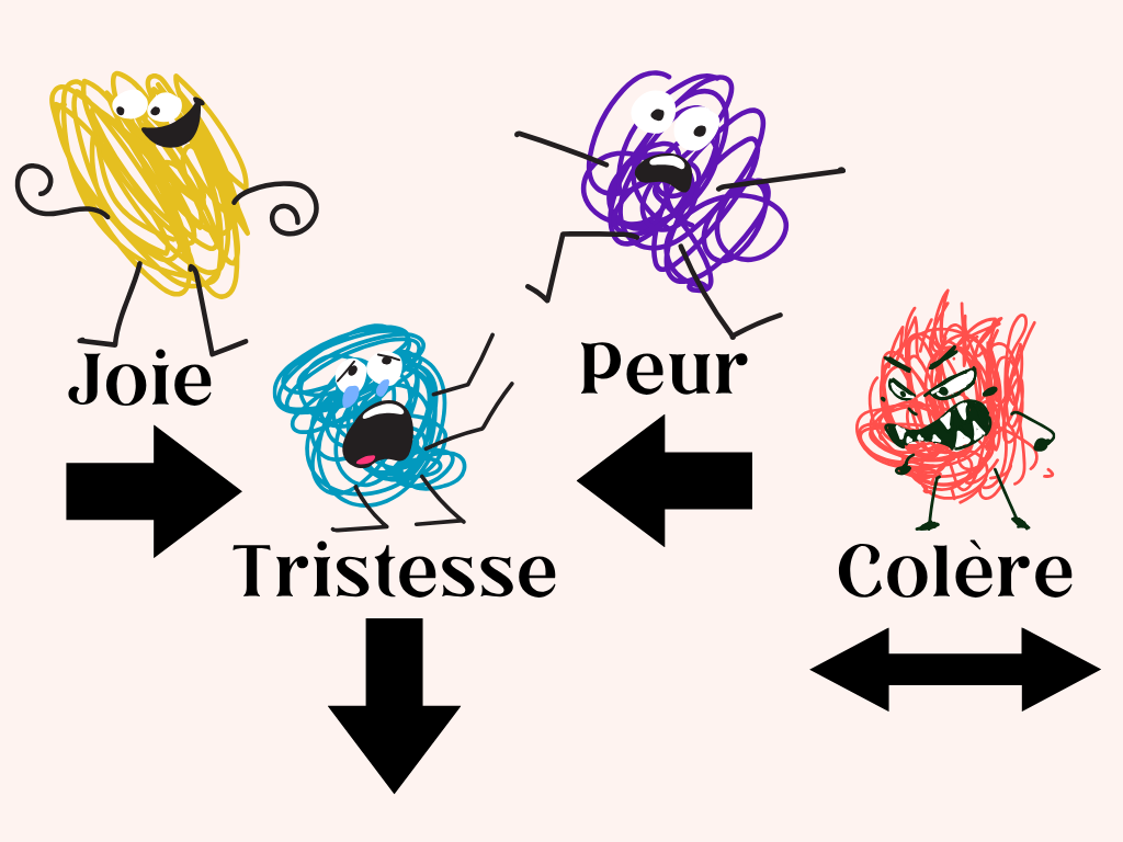 L’objectif est plutôt d’apprendre à la réguler au mieux, ainsi qu’à comprendre le message qu’elle souhaite nous délivrer. L’émotion est toujours là pour nous aviser qu’une situation nécessite notre attention. Peu importe si elle est confortable ou inconfortable à vivre sur le moment, elle ne souhaite jamais notre mal et n’est jamais négative en soi. Elle est là pour nous pousser à nous mettre en mouvement. Il est d’ailleurs fascinant de savoir que les quatre émotions qu’on ressent les plus souvent peuvent chacune être associée à un mouvement spécifique et représentés simplement par une flèche, soit: